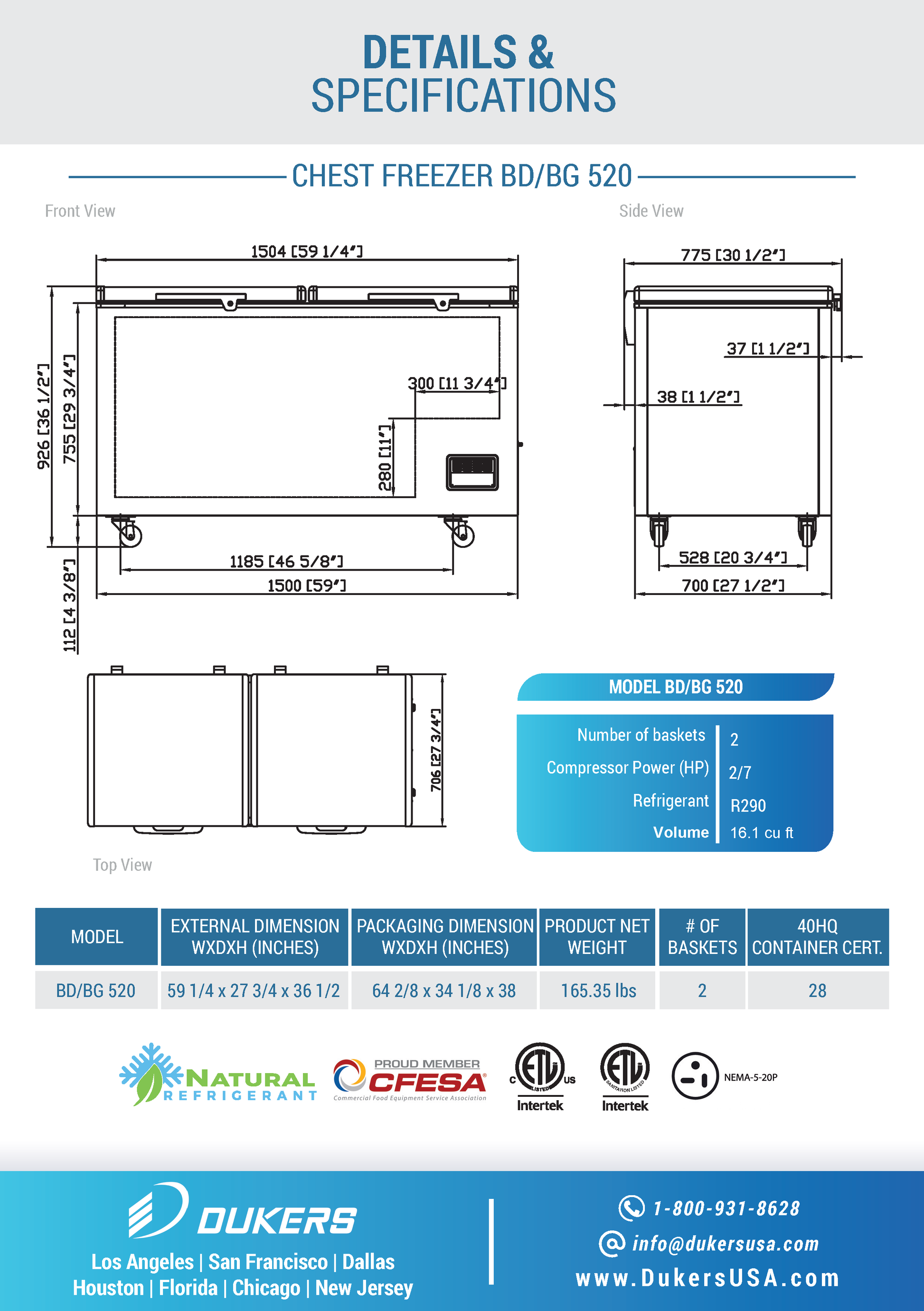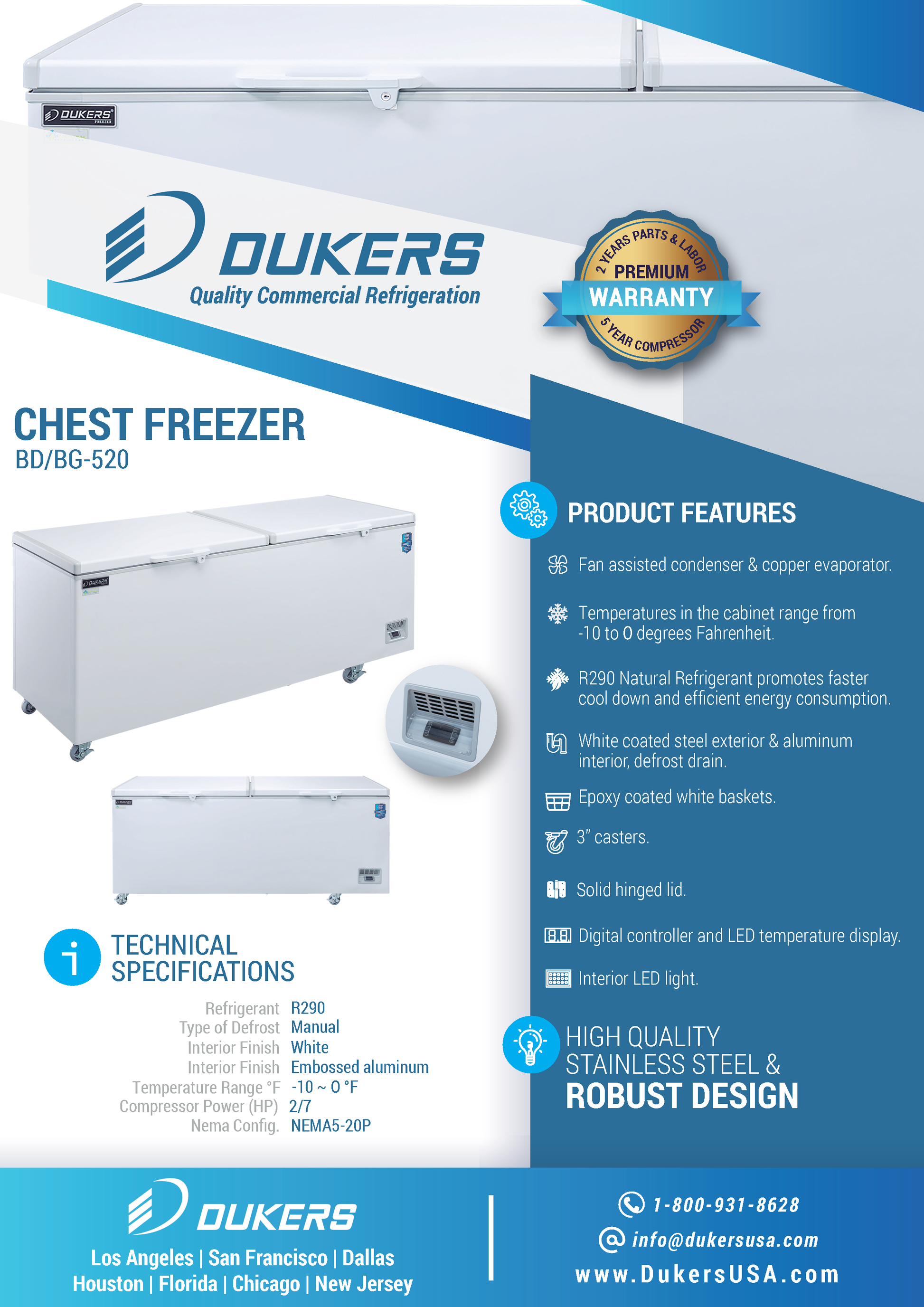 The Dukers BD/BG-520 commercial chest freezer has optimal storage capacity to store a variety of frozen foods. Solid open lid can better keep the low temperature. Using static cooling, each our chest freezer has a temperature range from 0 ~ -10°F with a fan assisted condenser.