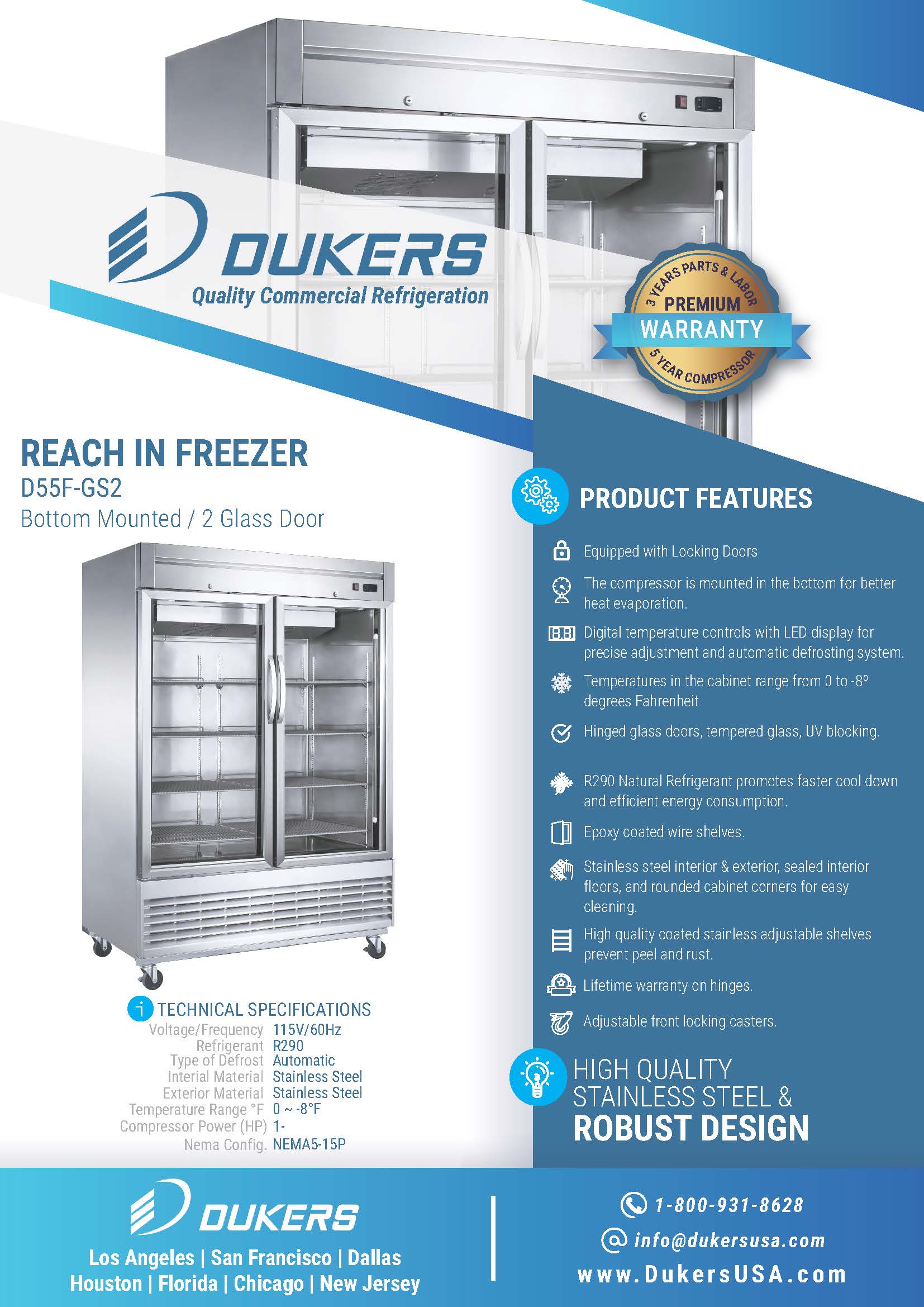The Dukers D55F-GS2 reach-in commercial freezer is designed to suit the needs of any business who needs optimal performance without sacrificing design. Its’ two tempered glass doors are accented with high-quality brushed stainless steel for both the interior and exterior to fit a variety of decors. Recessed door handles allow for clean styling and better ergonomics. The heavy-duty compressor is bottom mounted for excellent efficiency and cooling. Digital controls fine-tune the desired interior temperature. Self-closing doors free up your hands for added convenience and ease of use. Auto-defrosting provides lower energy costs and colder temperatures. The included 8 shelves can be adjusted or removed for flexibility and maintenance. Easily move and position with four swivel casters.