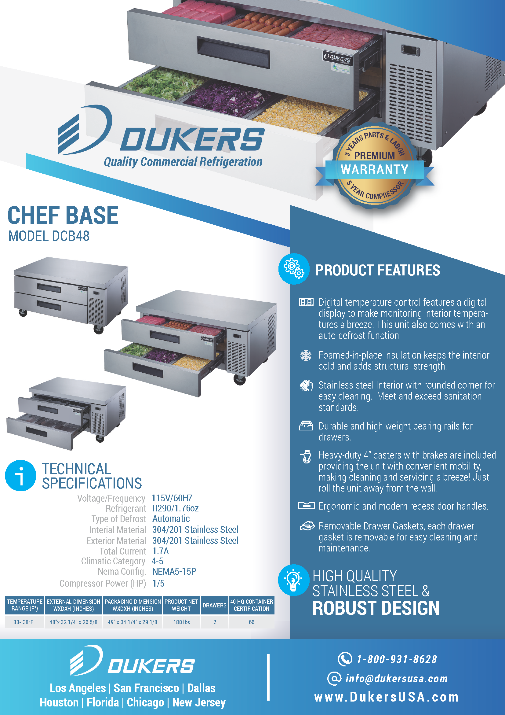The Dukers DCB48-D2 Chef Base Refrigerator with 2 Drawers is a robust refrigeration solution tailored for commercial kitchen environments. With two drawers and dimensions of 48" x 32 1/4" x 26 5/8", it offers ample storage space while seamlessly integrating into kitchen layouts. Its temperature range of 33~38°F, automatic defrost, and digital temperature control ensure precise temperature management for optimal food preservation. Constructed with stainless steel interior and exterior, along with rounded corners for easy cleaning and sanitation compliance, it prioritizes durability and hygiene. Featuring foamed-in-place insulation for structural strength and heavy-duty 4" casters with brakes for convenient mobility, cleaning, and servicing, it provides both functionality and convenience. Ergonomic recess door handles and removable drawer gaskets further enhance ease of use and maintenance. Backed by a warranty for commercial use, this chef base refrigerator is a reliable choice for commercial kitchens seeking performance and longevity.