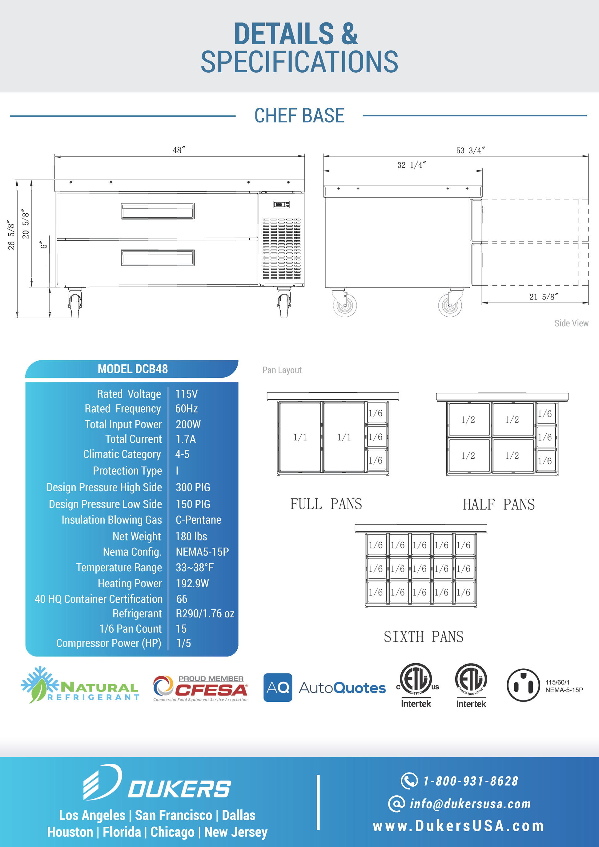 Dukers DCB48-D2 48"W Refrigerated Chef Base with 2 Drawers