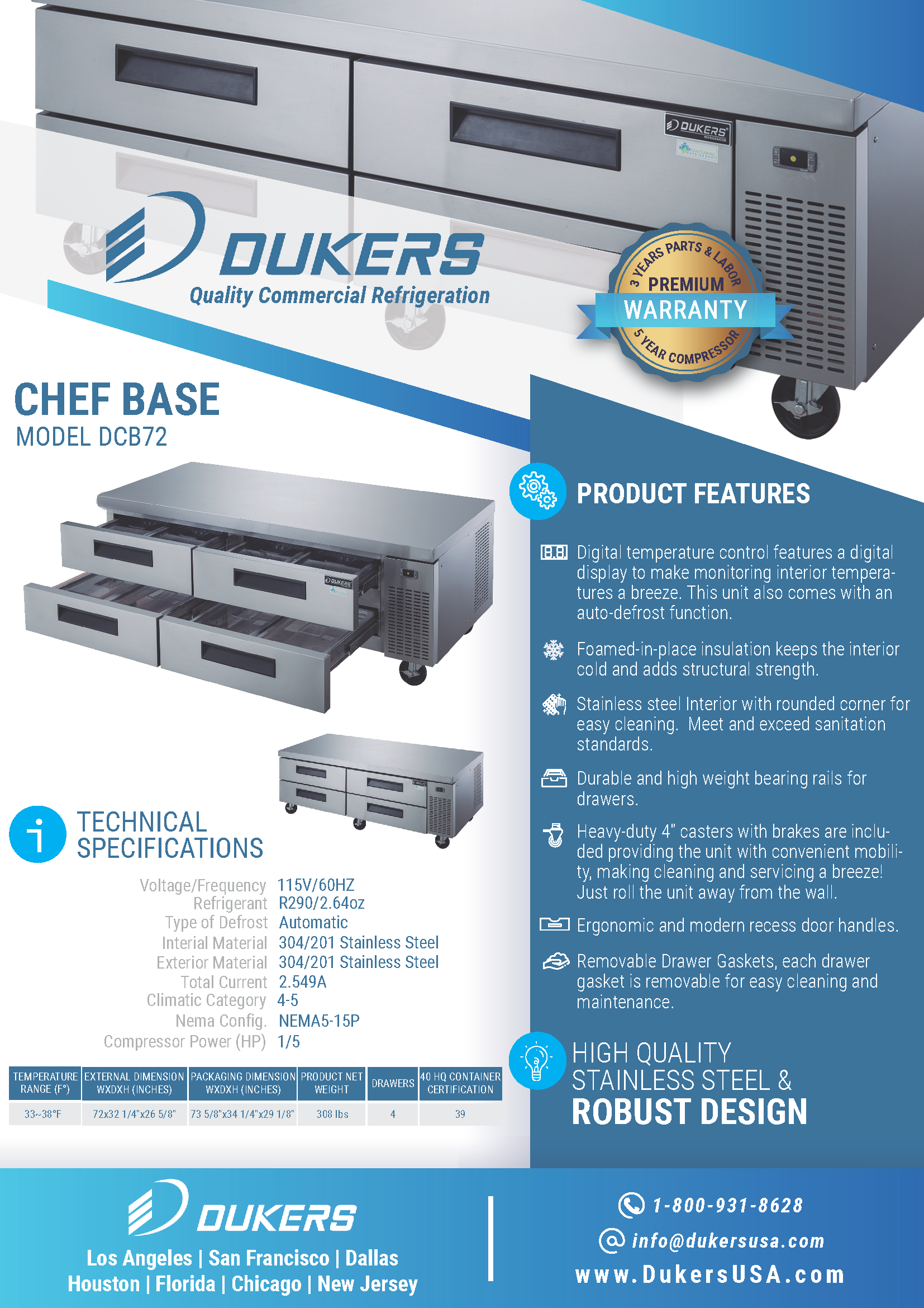 The Dukers DCB72-D4 Chef Base Refrigerator with 4 Drawers is a robust refrigeration solution engineered exclusively for commercial kitchen environments. Featuring four drawers and measuring 72" x 32 1/4" x 26 5/8" in dimensions, it provides ample storage space while seamlessly integrating into kitchen layouts. With a temperature range of 33~38°F and automatic defrost, it ensures precise temperature control for optimal food preservation. Constructed with stainless steel interior and exterior, along with rounded corners for easy cleaning and sanitation compliance, it prioritizes durability and hygiene. Equipped with digital temperature control and foamed-in-place insulation for added structural strength, it offers both functionality and reliability. The heavy-duty 4" casters with brakes provide convenient mobility for cleaning and servicing. Featuring ergonomic recess door handles and removable drawer gaskets, it enhances ease of use and maintenance. Supported by a warranty for commercial use, this chef base refrigerator is a dependable choice for commercial kitchens seeking performance and longevity.
