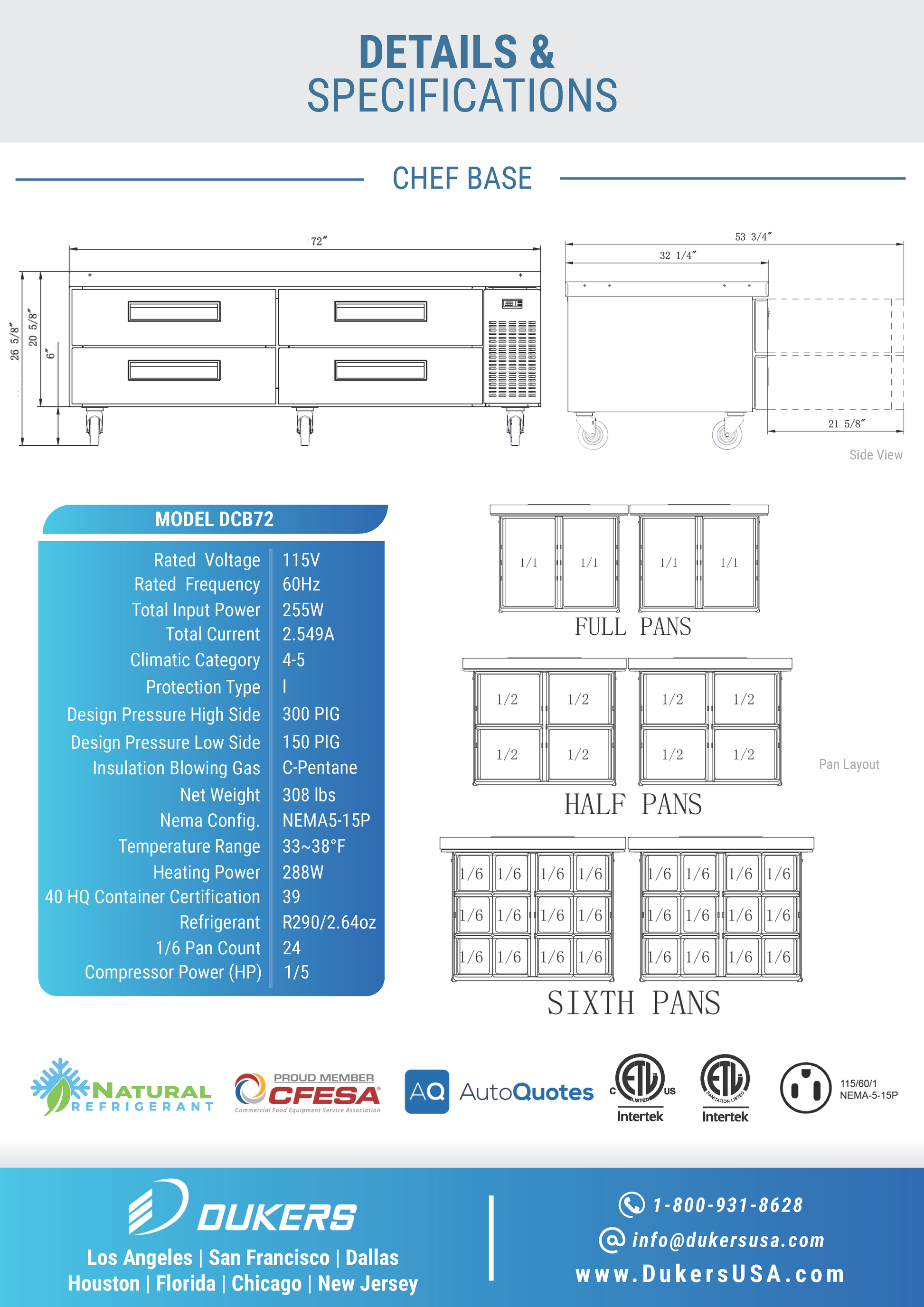 Dukers DCB72-D4 72"W Refrigerated Chef Base with 4 Drawers