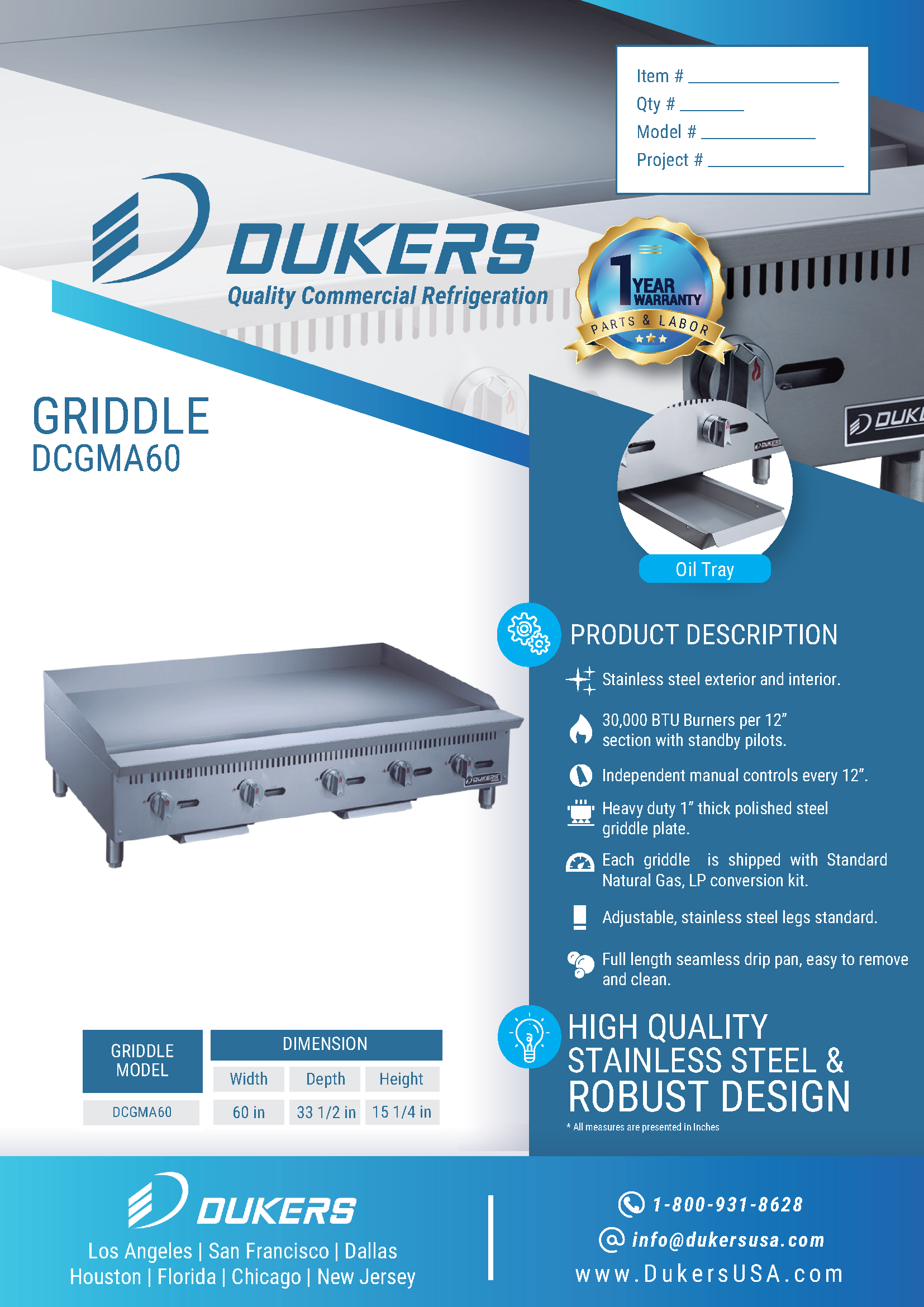 The Dukers DCGMA60 is a 60-inch W Griddle equipped with five burners, ideal for professional kitchen environments. Its stainless steel construction ensures durability and easy cleaning, both inside and out. With each burner generating 30,000 BTU/H and a combined output of 150,000 BTU/H, it delivers powerful and efficient cooking performance. Featuring independent manual controls every 12 inches, chefs can precisely adjust temperatures as needed. The griddle comes with adjustable stainless steel legs for stability and flexibility in setup. It is shipped with both Standard Natural Gas and LP conversion kit options, accommodating different gas sources. The heavy-duty 1-inch thick polished steel griddle plate and full-length seamless drip pan make maintenance effortless. Backed by a 1-year parts and labor warranty, the DCGMA60 ensures reliability and quality in commercial kitchen settings.