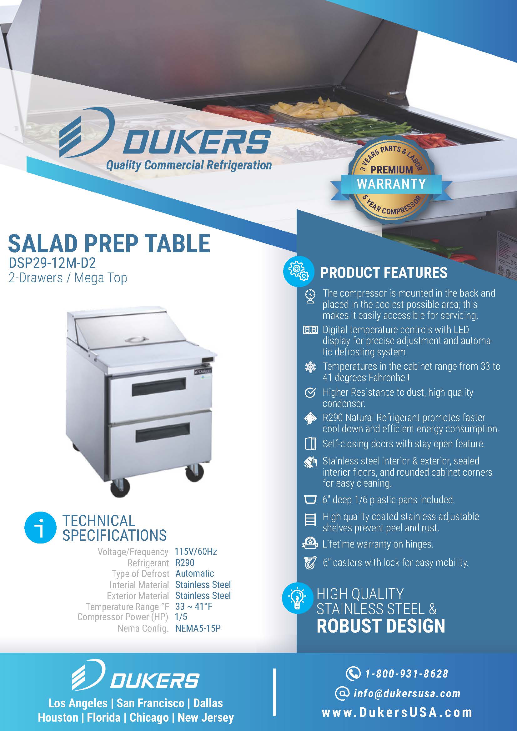 Dukers DSP29-12M-D2 29"W 2 Drawer Mega Top Refrigerated Prep Table