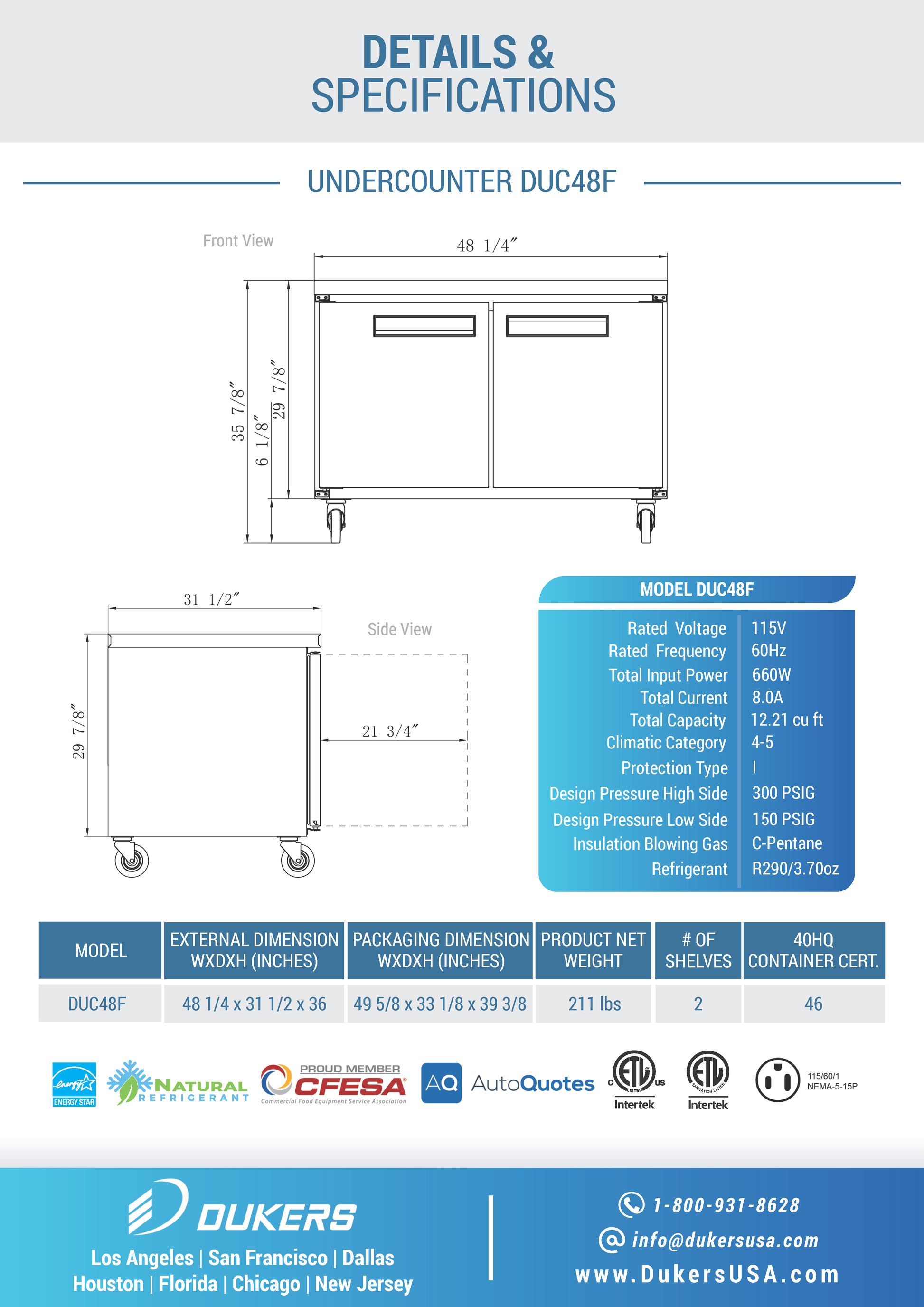 The Dukers DUC48F undercounter freezer has a spacious capacity and all over brushed stainless steel construction. With a range of 0 to -8°F, it chills and safely stores all type of food to sub-zero temperatures. Digital temperature controls and LED display lets you precisely pick the desired temperature. Designed with a bottom mounted 1/2 HP compressor for efficiency. Includes 2 adjustable and removable wire shelves.